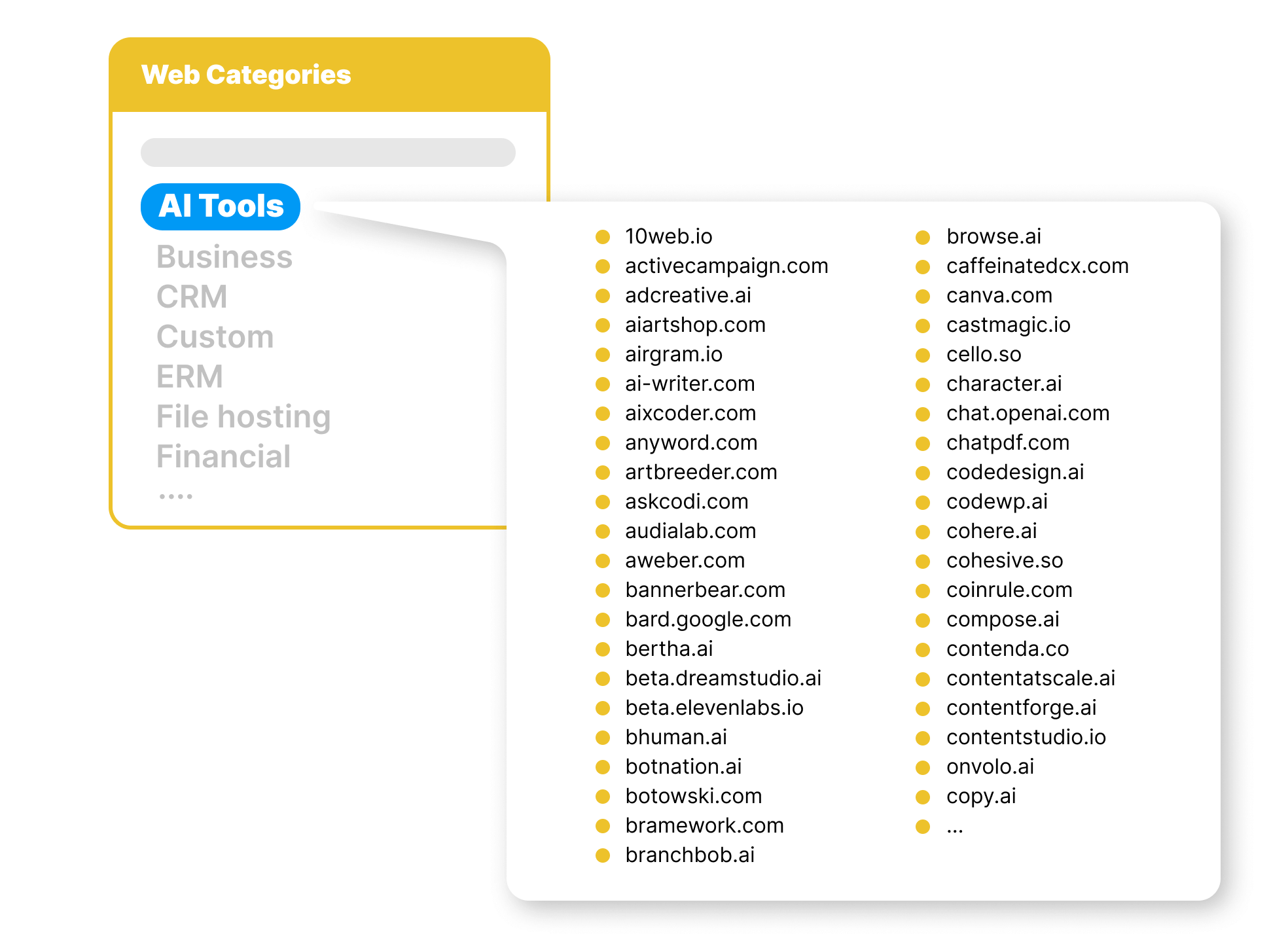 Safetica uses two approaches towards managing the use of GenAI tools within an organization. These approaches categorize GenAI tool-related websites and provide distinct ways to monitor and control usage.